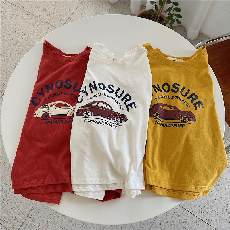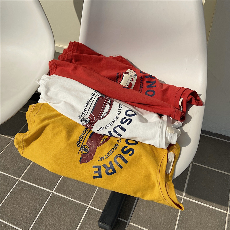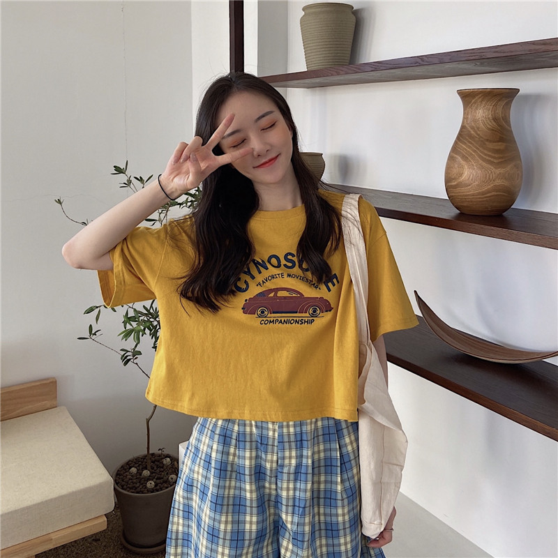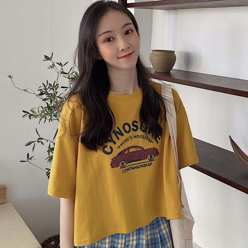 Featuring a classic round neck and conventional short sleeves, this versatile top can be effortlessly paired with high-waisted jeans or skirts for a laid-back yet stylish look. Choose from a vibrant red, sunny yellow, or classic white to match your personal style.